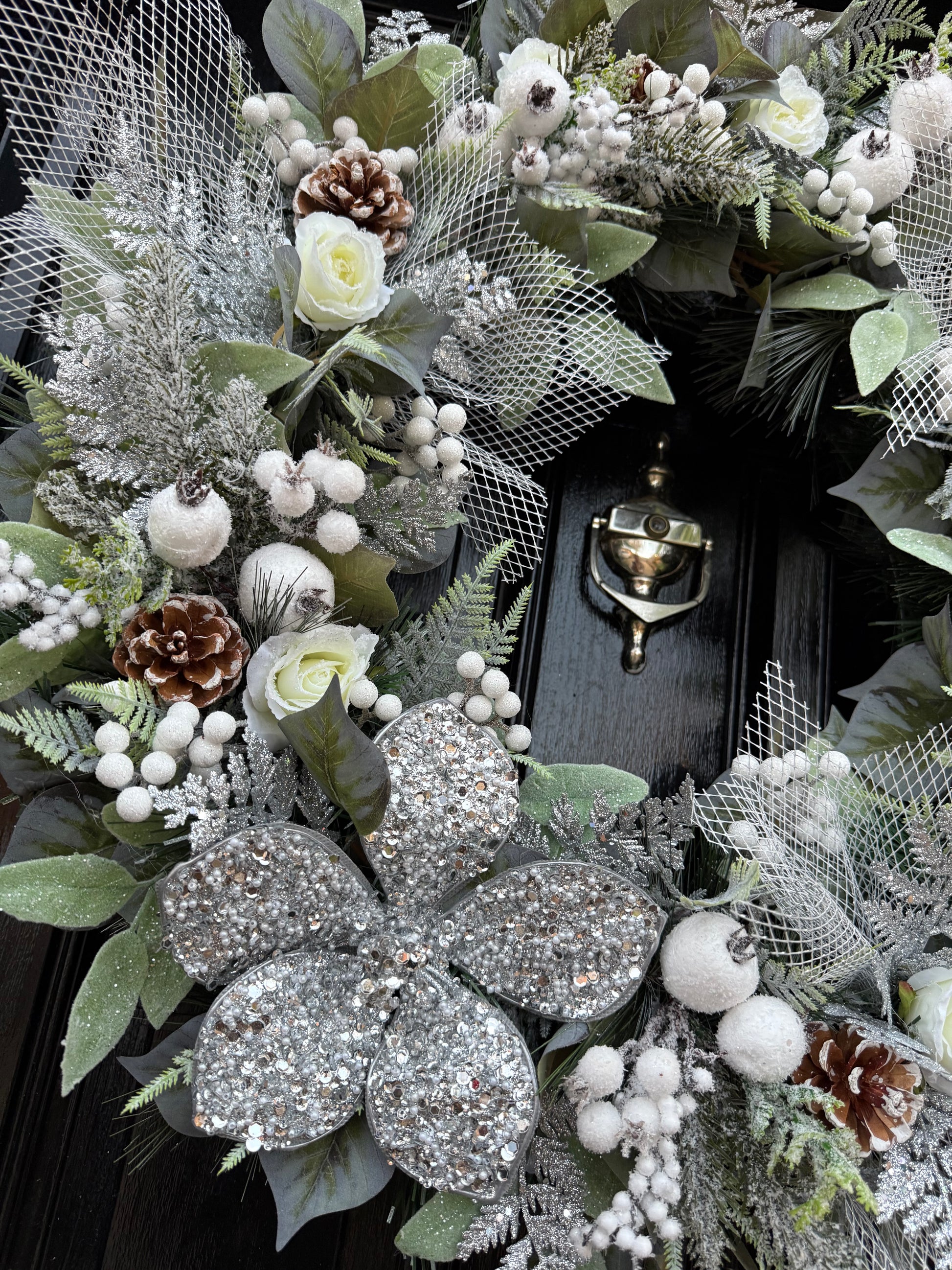 65cm DELUXE WINTER FROSTED FOLIAGE, ROSEHIP ROSES SILVER POINSETTIA WREATH