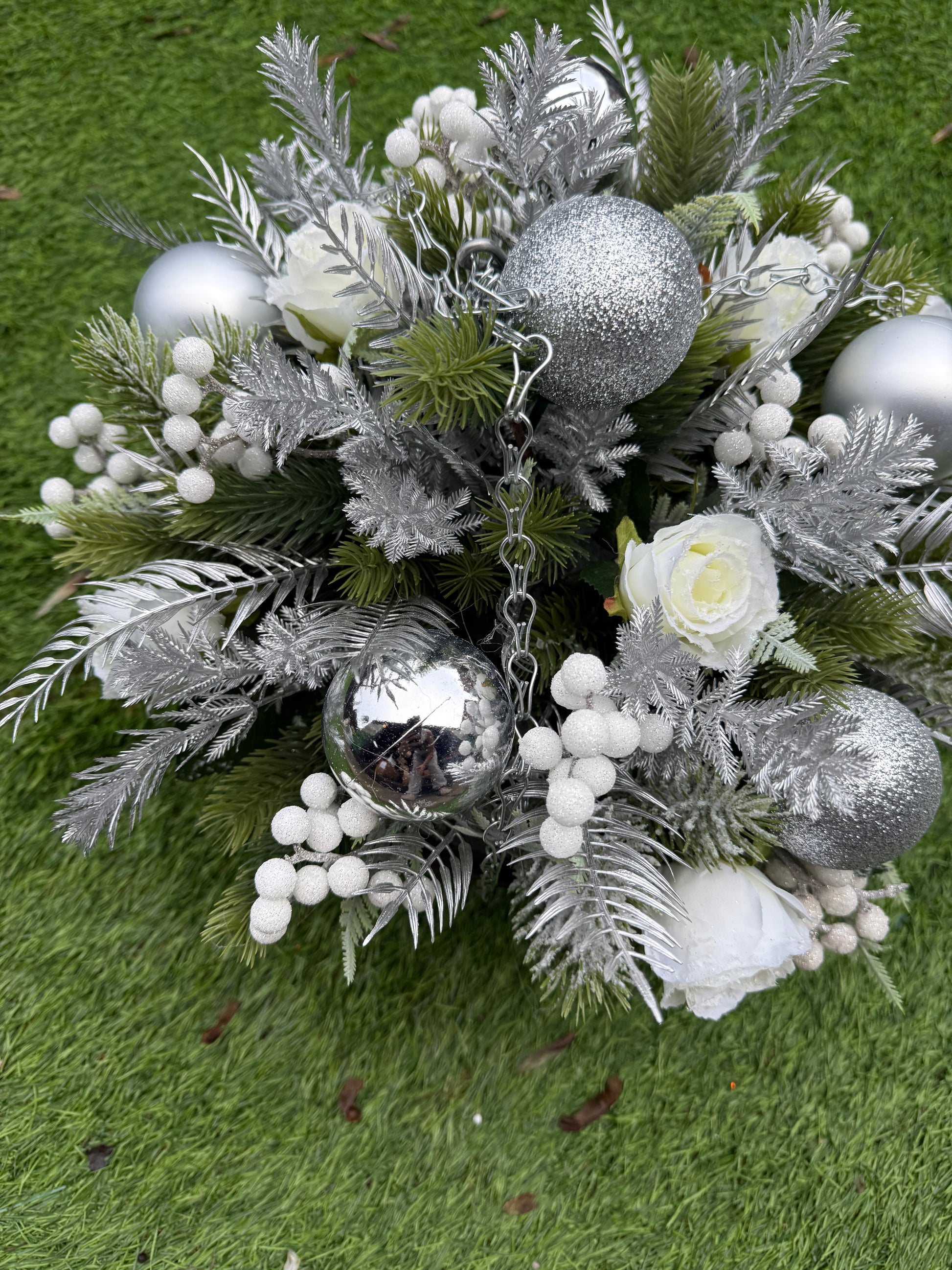 DESPATCH WITHIN 7 DAYS - 12inch ROUND WHITE SILVER WINTER TRADITIONAL CHRISTMAS HANGING BASKET
